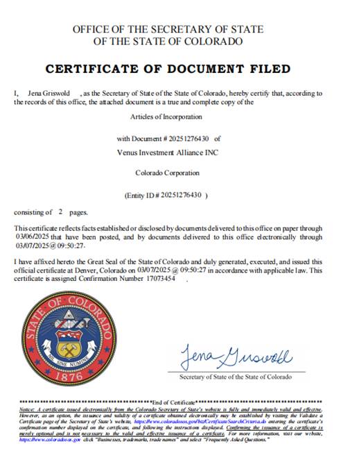 1. Venus Investment Alliance Unternehmensregistrierung und Lizenzierung